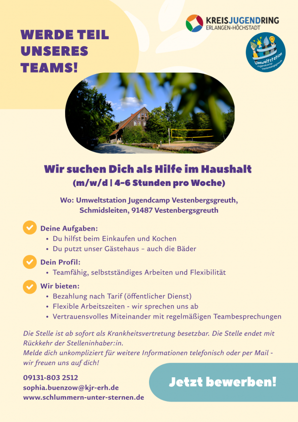 Wir suchen immer wieder Personen, die uns bei unseren Freizeiten unterstützen möchten, z.B. bei unserer inklusiven Freizeit, bei Ferienbetreuungsangeboten oder bei der Forschendenwoche der Umweltstation. Aber auch kurzfristig gibt es die Möglichkeit sich bei uns zu engagieren, zum Beispiel bei Tagesaktionen wie dem Familienfest des Landkreises (FamiFun), Aktionen zu aktuellen Wahlen im Landkreis und Erlangen oder Projekten der Umweltstation.