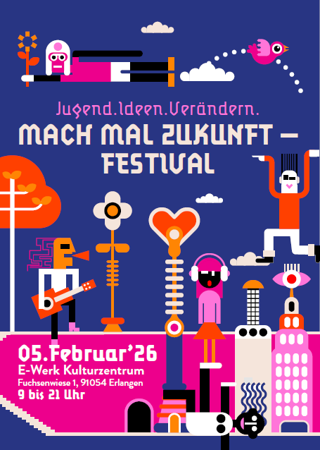 In spannenden Workshops am Vor- und Nachmittag könnt ihr Zukunftsideen entdecken, experimentieren und gemeinsam Visionen entwickeln – rund um Themen wie Umwelt, Zusammenleben, Digitalisierung oder Gerechtigkeit. Live-Aktionen, Musik und viele kreative Möglichkeiten zum Ausprobieren und Gestalten warten auf euch. Und weil das ZUSAMMEN viel leichter ist, veranstalten wir in Kooperation mit dem SJR ER und der Kommunalen Jugendarbeit ERH ein Zukunfts-Festival. Und laden euch dazu herzlich ein, gemeinsam Zukunft aktiv zu gestalten. Komm vorbei und mach mal Zukunft – mit deinen Ideen, deinem Engagement und deiner Neugier!
